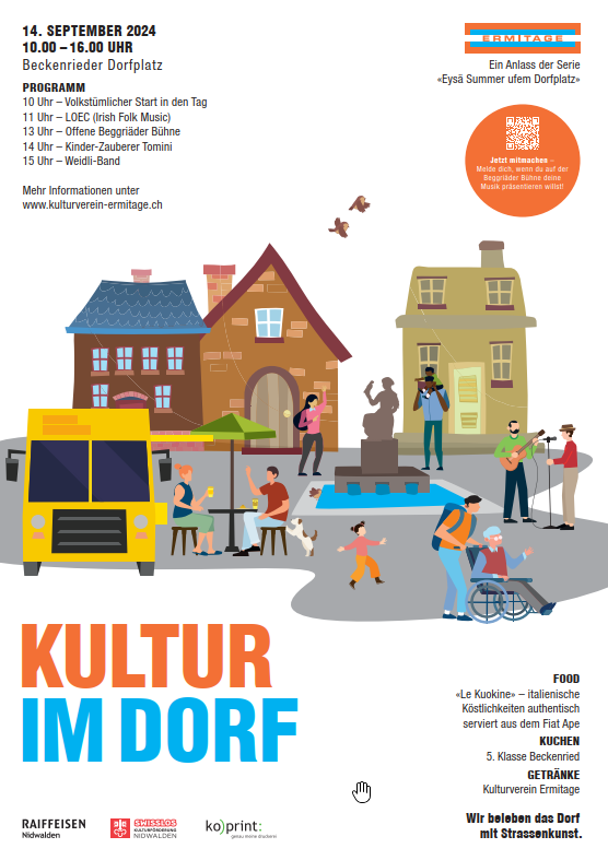 Der Kulturverein Ermitage belebt den Beckenrieder Dorfplatz. Das kleine aber feine Strassenkunst-Festival findet rund um die Schiffstation statt. Auch lokalen Künstler:innen bieten wir eine Bühne. Selbstgebackene Kuchen, Getränke und feine italienische Köstlichkeiten serviert aus dem Fiat Ape runden das Angebot ab.